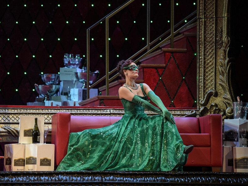 In seiner Inszenierung für die Deutsche Oper am Rhein hat Axel Köhler den Text modernisiert und auch die Rollenzuschreibungen etwas abgewandelt, denn Kammerzofen gibt es heutzutage nicht mehr, sehr wohl aber Reinigungskräfte, die hier noch Putze genannt werden. Kein Wunder also, dass die studierte Haushaltswissenschaftlerin Adele auf dem Fest gerne als Künstlerin auftritt. Statt per Brief wird sie dazu per SMS eingeladen.