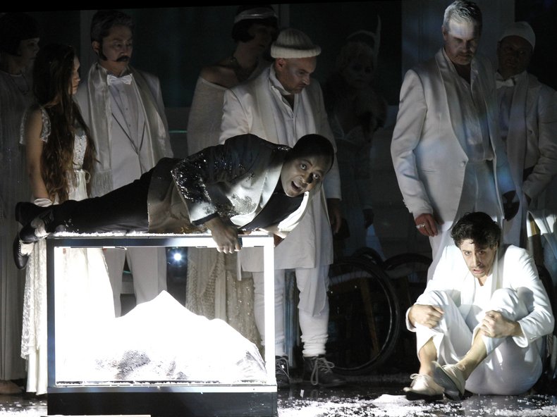 Die recht realistische Handlung der Oper erweitert Erath in eine zeitenübergreifende Atmosphäre. Er assoziiert den Everest als „Zauberberg“ und rückt das Gesellschafts-panoptikum in ein Ambiente wie bei Thomas Mann.