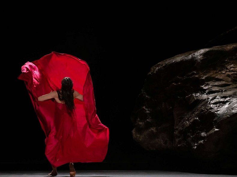 Das facettenreiche Bühnenbild von Peter Pabst lässt Gläser und Steine erkennen, die sich mit Musik, Poesie und Tanz in geheimnisvoller Weise verbinden. Das Tanztheater Wuppertal Pina Bausch agiert manchmal durch stilvolle Zurückhaltung. Im Zentrum steht ein mondähnlicher Felsen im Spiegel einer endlosen Nacht, in der die 14 Tänzer spannungsvoll agieren. Und es gibt immer wieder den großen Regen wie in dem gleichnamigen berühmten Hollywoodfilm.