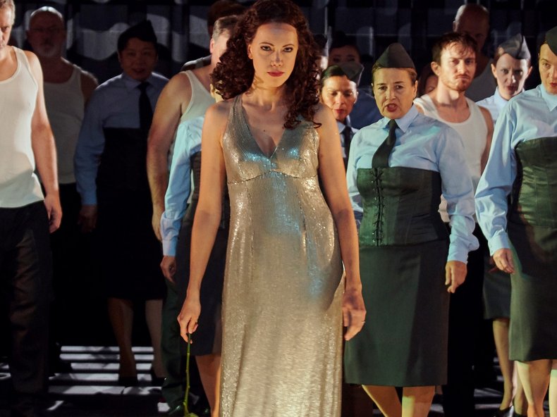 Carmen verwandelt sich in der Stuttgarter Inszenierung vielleicht auch in diesem Zusammenhang in eine lustvolle Obsession. Der Mord wird zur Befreiung vom Trieb. Bis zur berühmten Habanera erlebt man verschiedene Eröffnungen. Das reicht vom Chor der Soldaten über den Chor der Gassenjungen, jungen Liebhaber bis hin zum Chor der Fabrikarbeiterinnen. Der Denk- und Handlungsraum von Carmen wird immer wieder erweitert. So breitet sich auch der Atem der Freiheit wie die Trikolore der Muse bei Delacroix aus.
