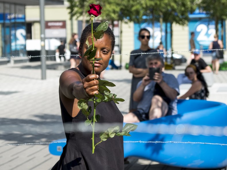 Priscila Rezende ist eine interdisziplinäre Künstlerin. In Performance, Installation und Fotografie beschäftigt sie sich mit Race, Identität, Teilhabe, Repräsentation und Präsenz Schwarzer Menschen und insbesondere Schwarze Frauen in der gegenwärtigen Gesellschaft. Aus ihrer eigenen Erfahrung als Schwarze lateinamerikanische Frau deckt sie in ihren Performances auferlegte Begrenzungen, Diskriminierung und Stereotype auf und tritt dabei in einen direkten und transparenten Dialog mit dem Publikum. Sie holt uns aus der Komfortzone und bringt uns dazu, festgelegte Gewissheiten in Frage zu stellen.
