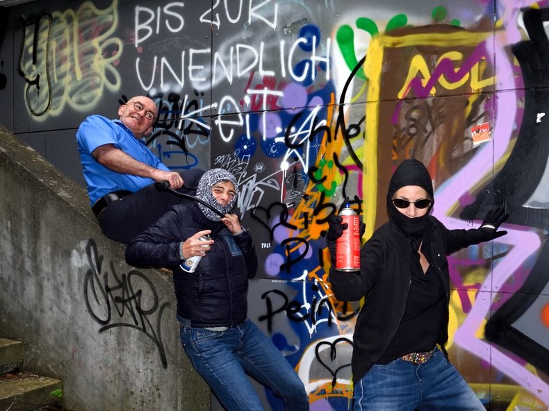 Der Spielort ist geschichtsträchtig: An der Völderndorffstraße beim Scheidplatz steht das Willi-Graf-Gymnasium. Der verschattete Ort vor der mit Graffitis überzogenen Rückwand des Gymnasiums an der Völderndorffstraße, den ein Sträßlein einbremst, schwingt sich gegenüber dem geteerten Weg zum lichten Hügel auf. Luft- und Sonnenhungrige schauen auf dem Gipfel des begrünten Schuttbergs über Schwabing West. Die Wanderer atmen auf den Trümmern ihrer Stadt. Wie eine Wehr sperrt sich die Wand der Bildungsstätte rau gegen das Vergessen. Wilde, fiebrige Farbsignale, auf die Betonplatten gehetzt, gesprüht, erzählen von Freiheit und Kampf. Ausgrenzung, Wut, die Einsamkeit der Widerstandskämpfer in der Nacht vor dem Schafott sind hier manifestiert. Gert Neuner: „Das Vergessen wächst wie das Gras den Hügel hinauf über die vergangene Schuld. Wir sollten uns daran erinnern, sie mit unseren heutigen Nöten abgleichen und unsere Ängste neu justieren.“