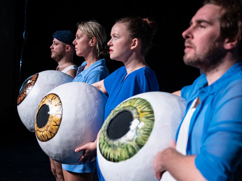 In chronologischer Handlung folgen wir den vier Hauptfiguren des Stücks durch sommerliche Hitze: Bocki, Eis und Pizzasnack in Händen und Mündern der anderen Campingplatzgäste. Das Meer kann man förmlich riechen. Wir erleben, wie die Stimmung kippt, wie Geschädigte und Tatverantwortliche aus dem Kreis der Gruppe hervortreten, verletzt werden oder auch Positionen ändern. Immer mit dabei, die anderen Urlauber*innen, Zeugen*innen des Geschehens als Chor der „Augen“: