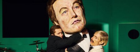 Auf der Bühne steht ein riesiges Bühnenbild aus verschiedenen Metallelementen. Darauf verteilt sich das Ensemble in verschiedenen Posen.