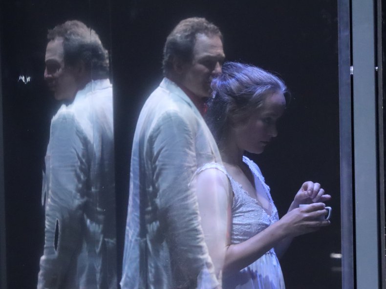 Die VR-Artists und FAUST-Preisträger Jan Schulten und Tobias Bieseke bringen in Videosequenzen die KI auf die Bühne. Während ihre Videokunst mit Hilfe von VR-Brillen bei „Wann, wenn nicht jetzt?“ das Publikum in den Friedenssaal entführten, schaffen die beiden VR-Künstler Metaebenen mit Hilfe von Videoprojektionen. Tobias Bieseke erklärt seine Arbeit wie folgt: Die Videoebene des Meta-FAUST ist eine Matrix, die von einer künstlichen Intelligenz (KI) durchdrungen ist. Dieses tief verzweigte Wurzelsystem isoliert Faust nicht vollständig in seiner Geschichte, sondern lässt ihn mit unserer Welt interagieren. So dringt die KI durch Spiegel, Fenster und Türen in die Bühnenwelt ein und erzeugt mittels ihres Algorithmus eine Zwischenwelt, die versucht, Gedankliches aus den Figuren herauszulösen und zu projizieren. Um dies zu unterstützen hat Ausstatterin Annette Wolf neben einer magischen Spiegelwelt auf der Bühne auch intelligent leuchtende Kostüme erschaffen.
